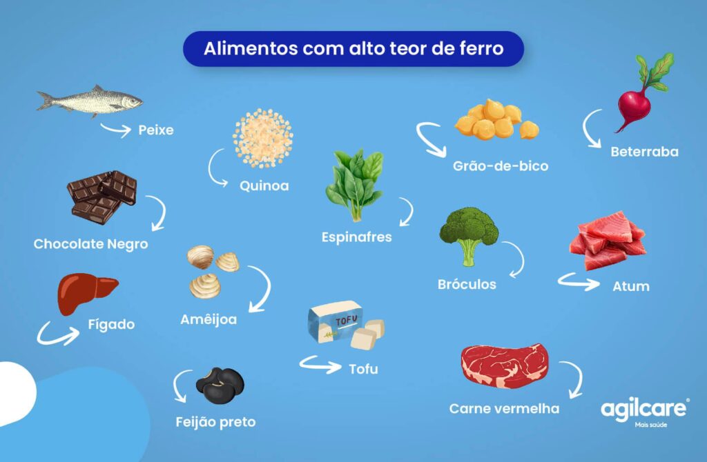 - Brócolos: Uma chávena (156g) de brócolos cozidos contém 1 mg de ferro, além de serem ricos em vitamina C, vitamina K e folato.