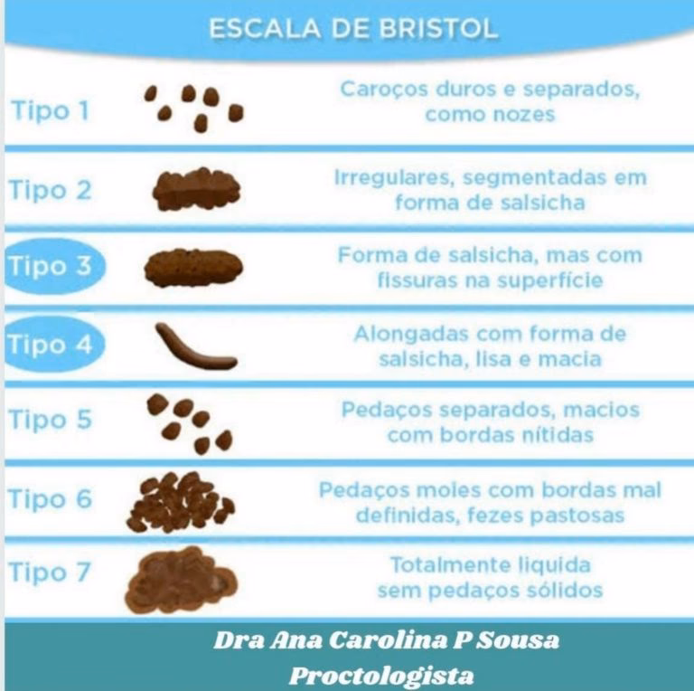 - Consistência: As fezes devem ter uma consistência adequada (tipo 3 ou 4 na Escala de Bristol), nem muito líquidas nem muito duras.