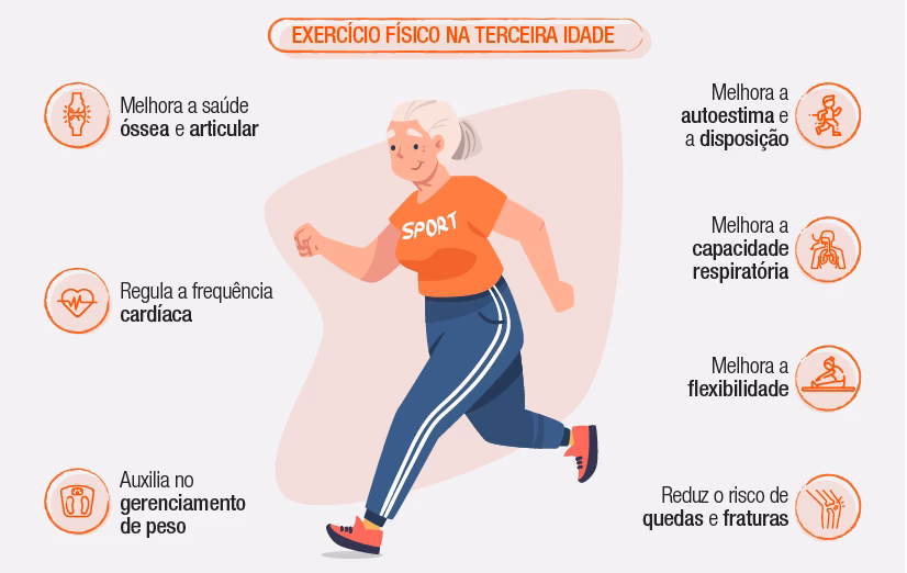 | Físicos | Saúde cardiovascular aprimorada (coração e pulmões mais fortes, redução de pressão e colesterol), fortalecimento ósseo (prevenção de osteoporose), controle de peso (combate à obesidade), aumento da resistência e força muscular, prevenção de doenças crônicas (diabetes, hipertensão, câncer), melhora da agilidade e flexibilidade. |