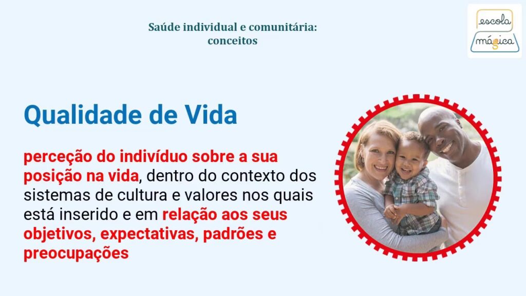 Em paralelo à saúde, a OMS também define a qualidade de vida. Segundo a organização, trata-se da percepção que cada indivíduo tem da sua posição na vida, considerando o contexto cultural e o sistema de valores em que vive. É um conceito inerentemente subjetivo, variando significativamente entre culturas e pessoas, e dinâmico, pois se altera ao longo do tempo conforme as experiências e circunstâncias de cada um. A avaliação da qualidade de vida é multidimensional, englobando seis domínios essenciais: